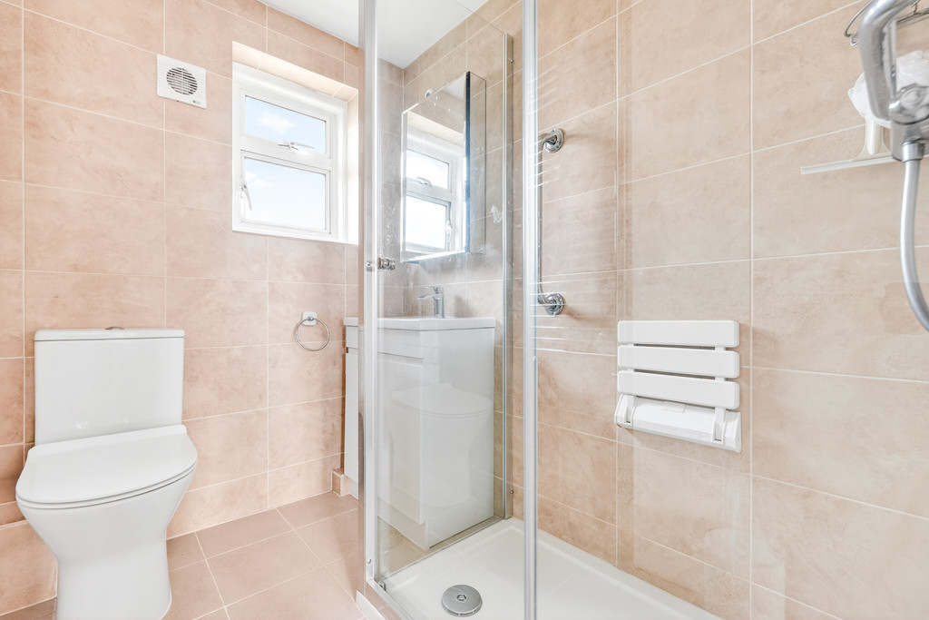 BATHROOM/WC Shower with glass doors, WC, wash hand basin with storage below, tiled & walls, chrome heated towel rail, double-glazing, glass fronted medicine cabinet.