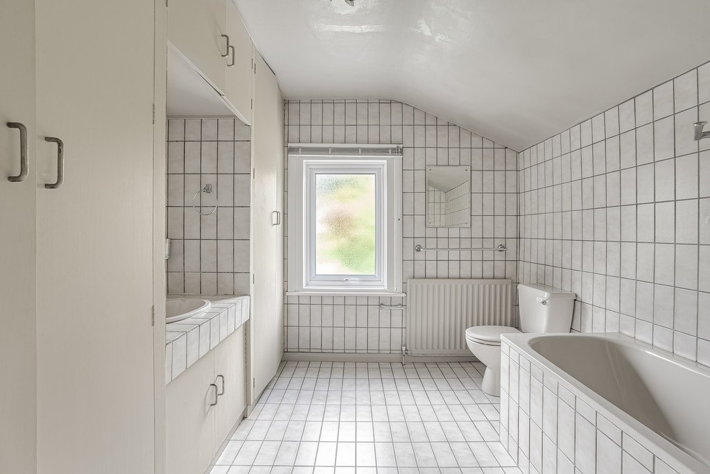 BATHROOM/WC Bath with mixer tap & shower attachment, WC, wash hand basin with storage below, tiled floor & walls, radiator, double-glazing, built-in storage cupboards.