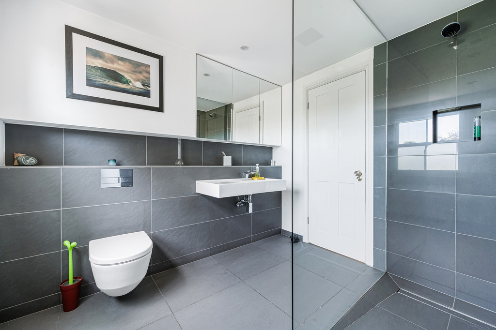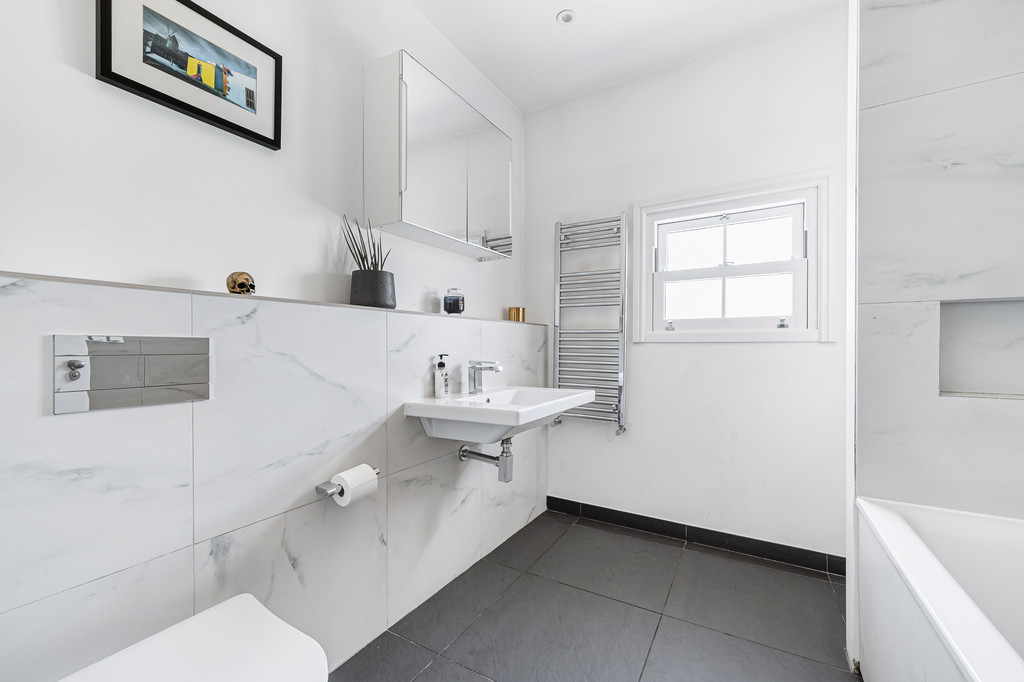SHOWER ROOM/WC Large (1400mm) tiled shower area with glass screen, WC, Kartell Laufen wash hand basin, chrome heated towel rail, frosted double-glazed sash window, tiled floor with under floor heating, built-in storage/medicine cabinets.
