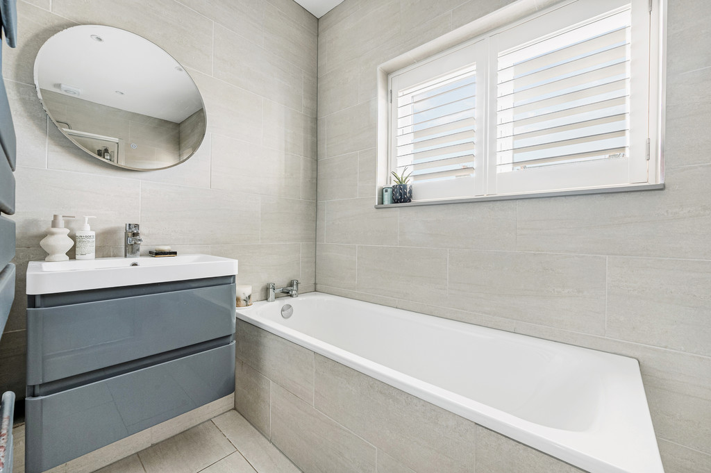 BATHROOM/WC Bath, wash hand basin with storage below, WC, heated towel rail, double-glazing, tiled floor, tiled shower cubicle.
