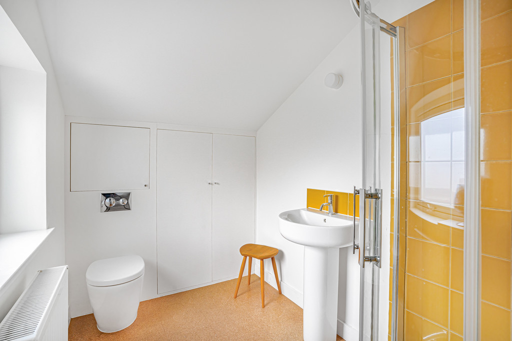 ENSUITE SHOWER/WC Shower cubicle, storage cupboards, pedestal wash hand basin, cork floor tiles, WC, cupboard housing central heating boiler, radiator, double-glazing with frosted glass.