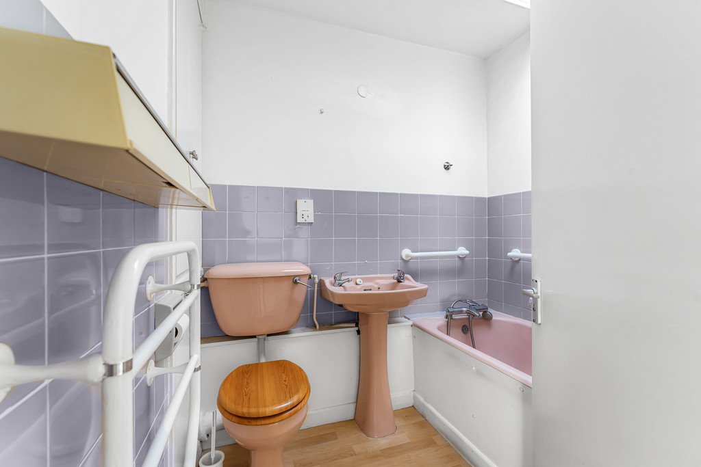BATHROOM/WC Pink suite; bath, WC, pedestal wash hand basin, heated towel rail, skylight, storage cupboard.