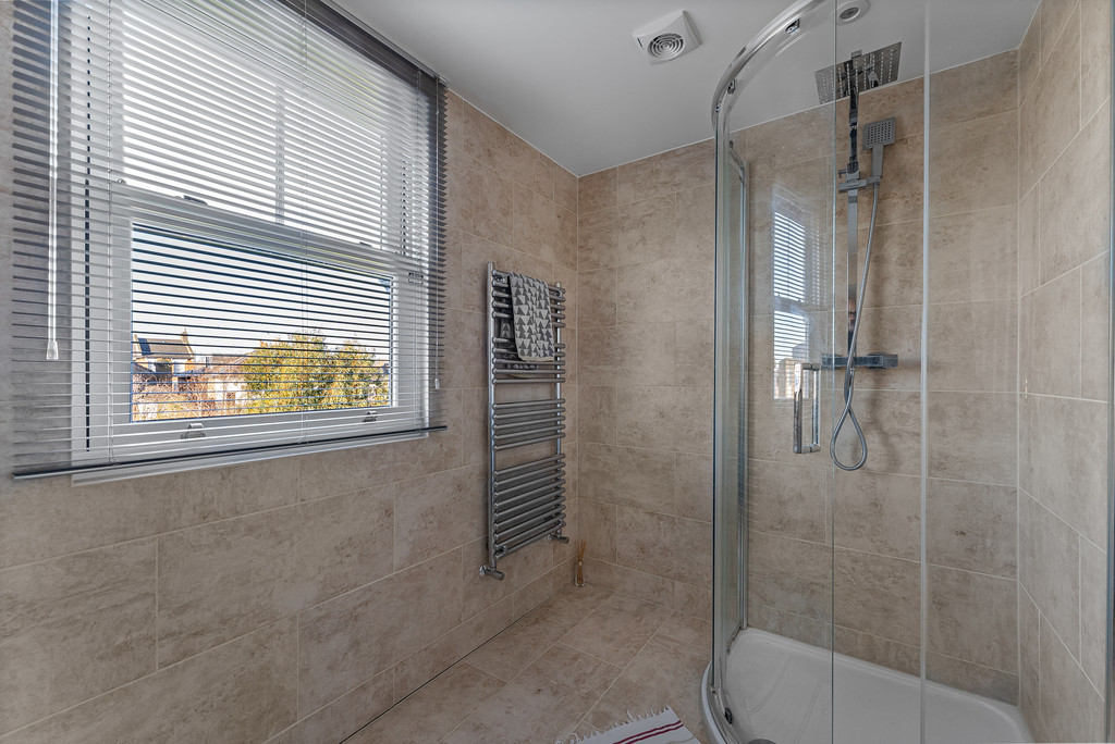 SHOWER ROOM/WC Tiled shower cubicle, WC, pedestal wash hand basin, double glazing, tiled floor & walls, chrome heated towel rail.
