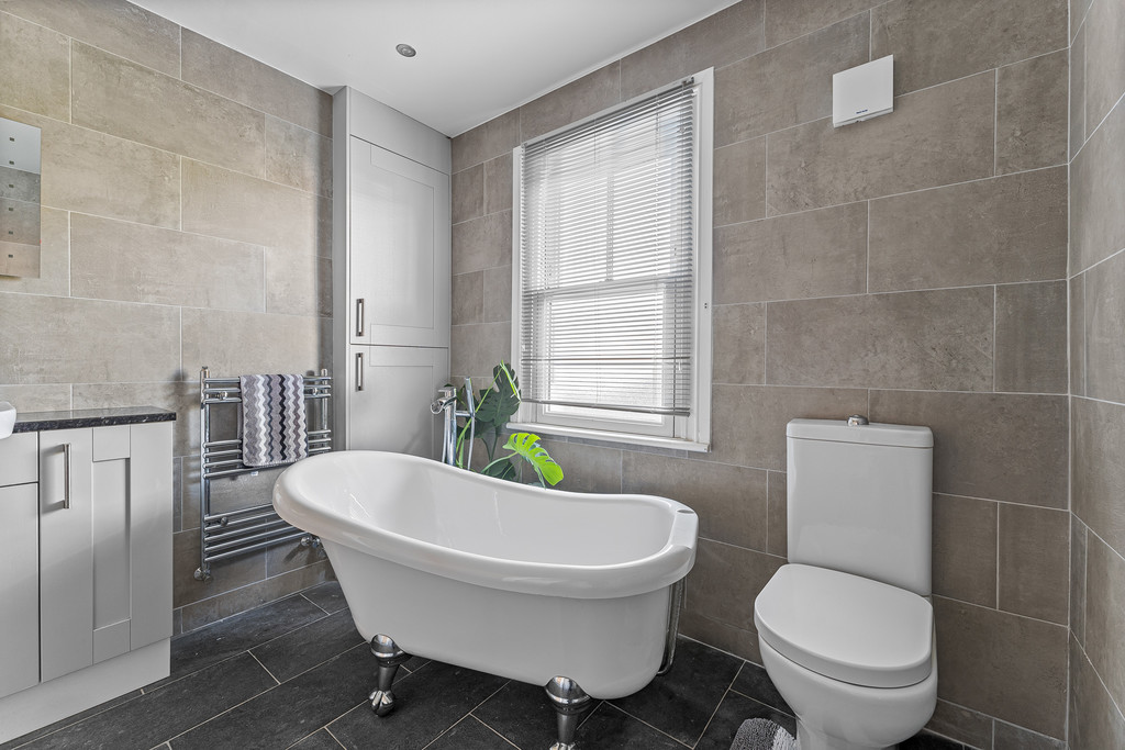 BATHROOM/WC Claw foot bath, wet-room style shower with glass screen, WC, wash hand basin with storage below, tiled floor & walls, chrome heated towel rails, double-glazing, WC, cupboard housing central heating boiler, stripped pine door.