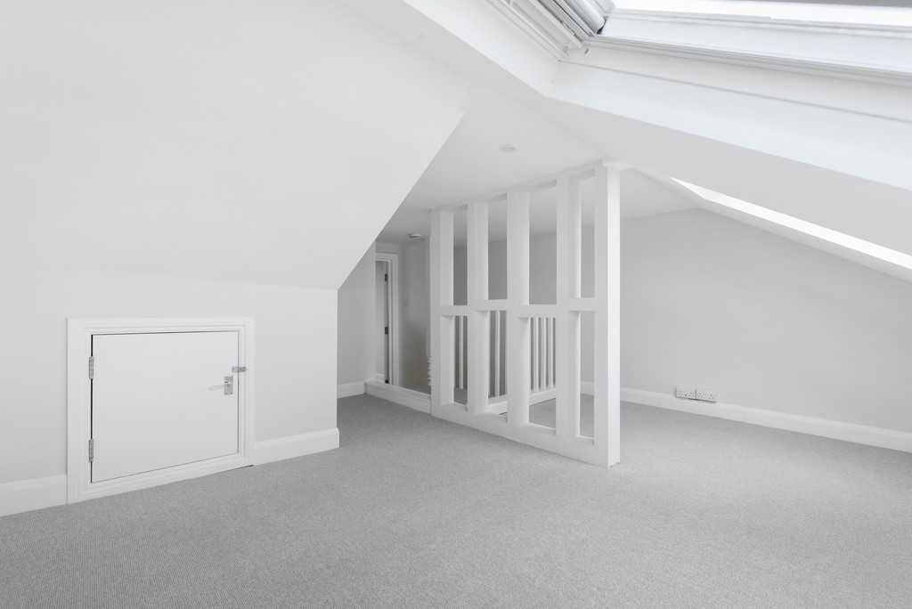 The first floor provides two double bedrooms and a generous bathroom, complemented by a dressing room that works equally well as a walk-in wardrobe. The converted loft adds a further bedroom with en-suite facilities, plus a useful ancillary space with restricted head height and extensive eaves storage.