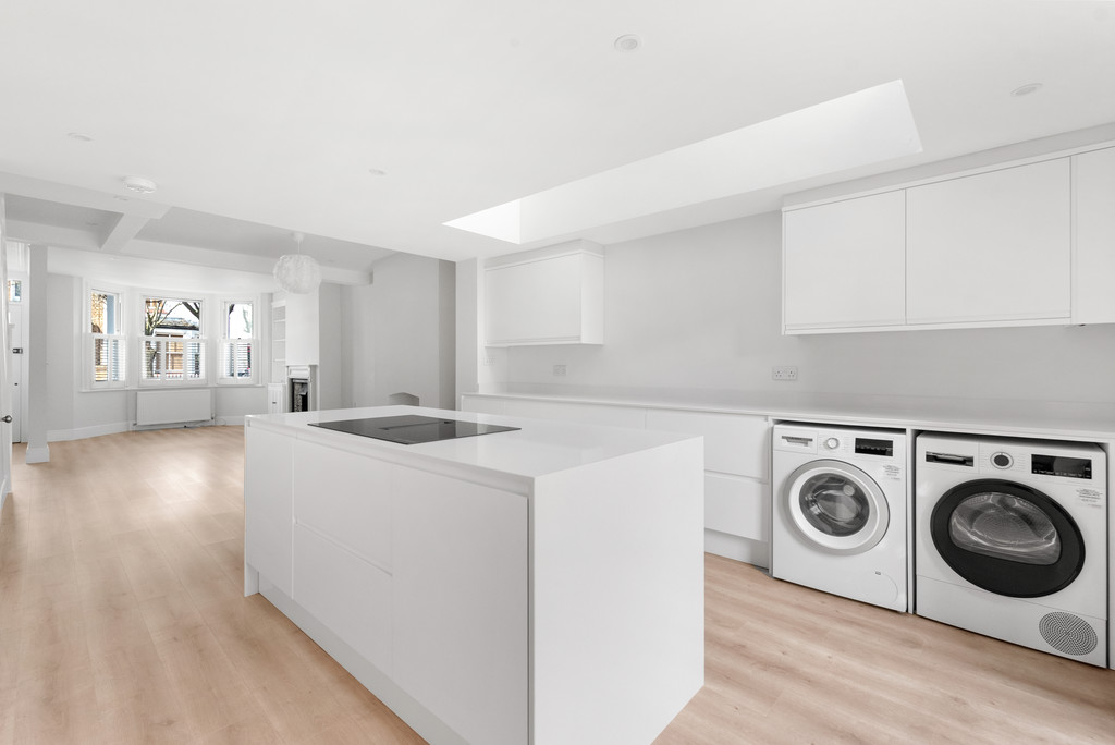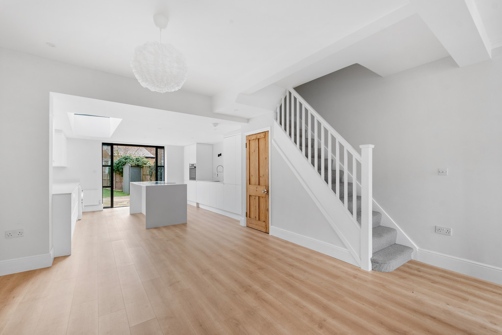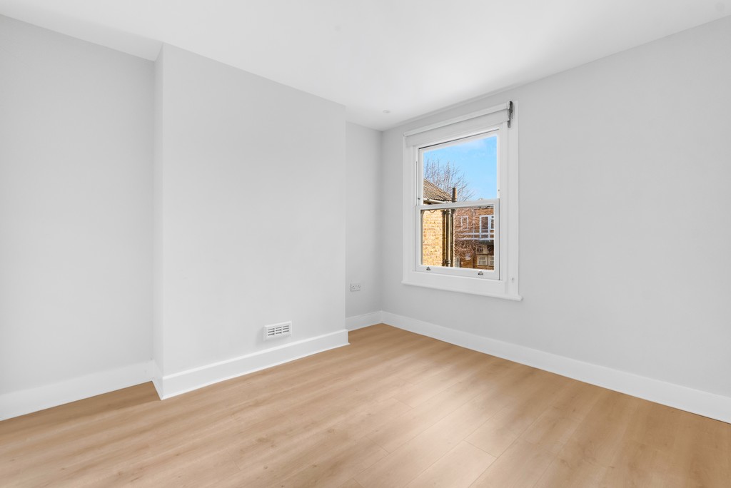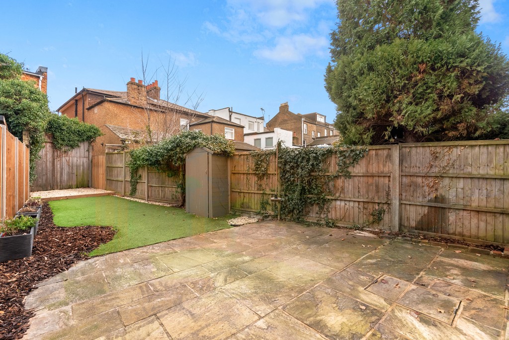This well-proportioned Victorian terrace blends original detail with thoughtful updates across three double bedrooms, a study area and two bathrooms. A high-ceilinged entrance hall with retained coving leads to a front reception with a wide bay, double-glazed sash windows and plantation shutters. To the rear, a substantial kitchen extension incorporates integrated Bosch appliances and opens via French doors to a notably large, low-maintenance garden.