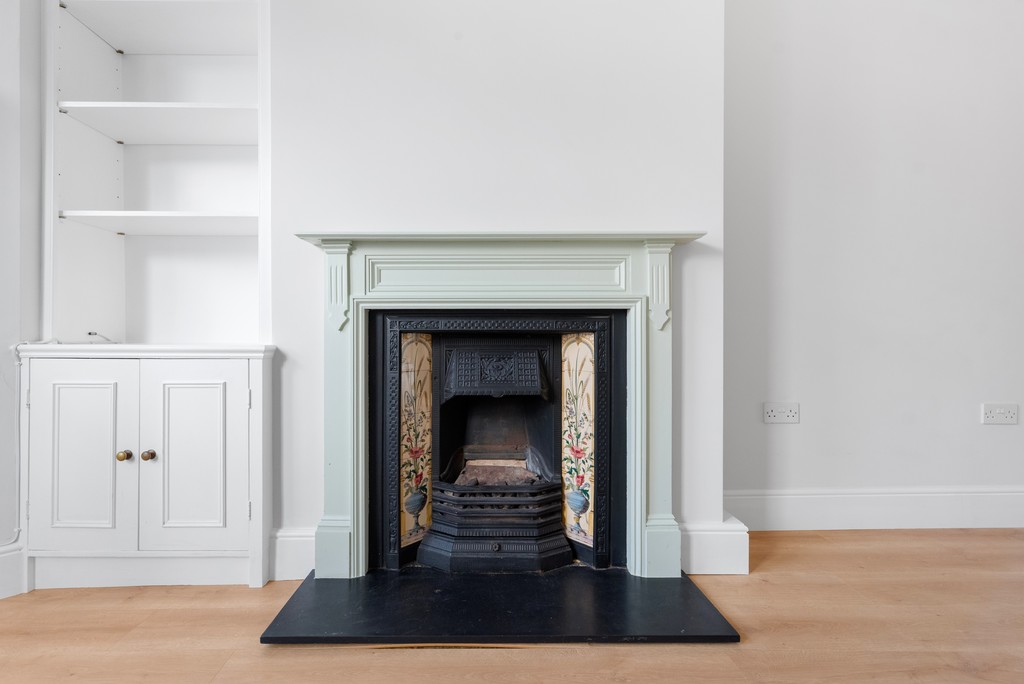 LIVING ROOM Radiator, double-glazed sash windows with plantation style shutters, cast iron fireplace, laminate flooring, built-in shelving/storage.