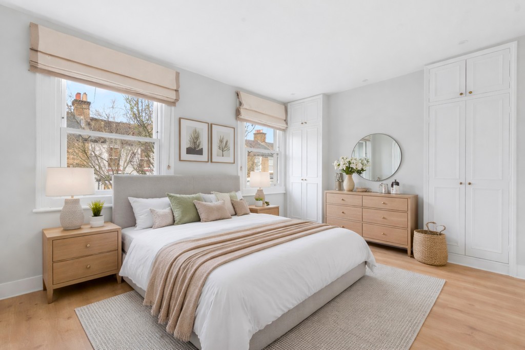 BEDROOM Double-glazed sash windows, radiator, laminate flooring, built-in wardrobes, stripped pine door.