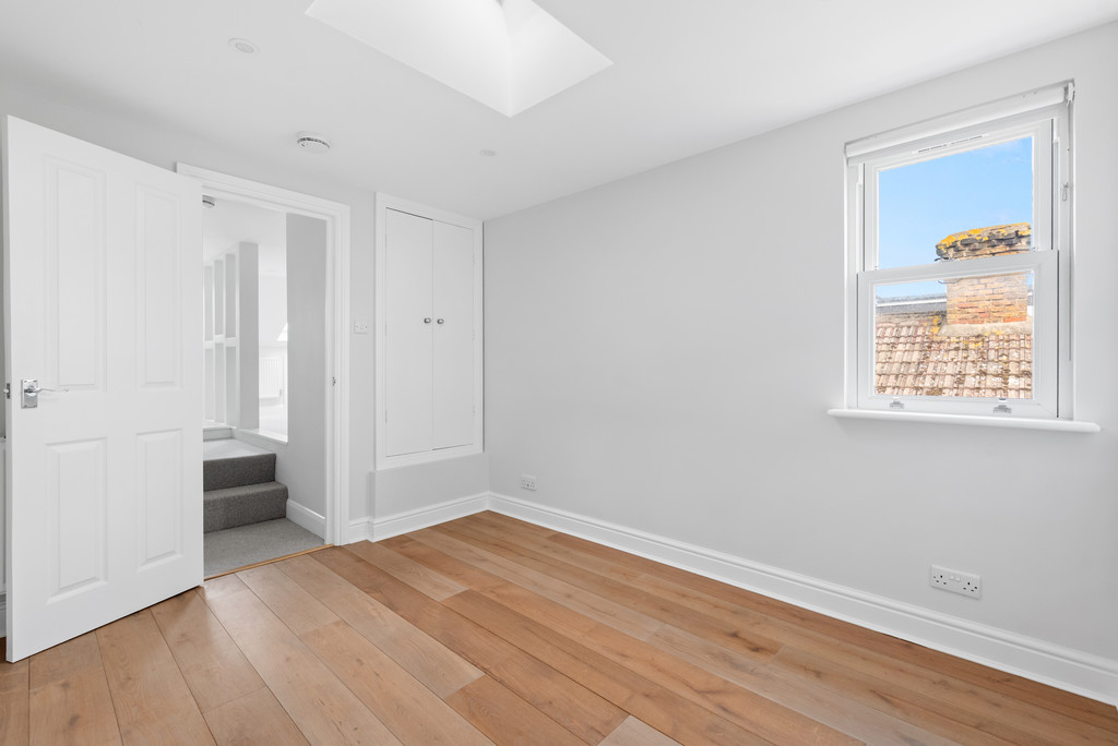 Oak flooring, double-glazed sash window, Velux window, storage cupboard, radiator, door to: