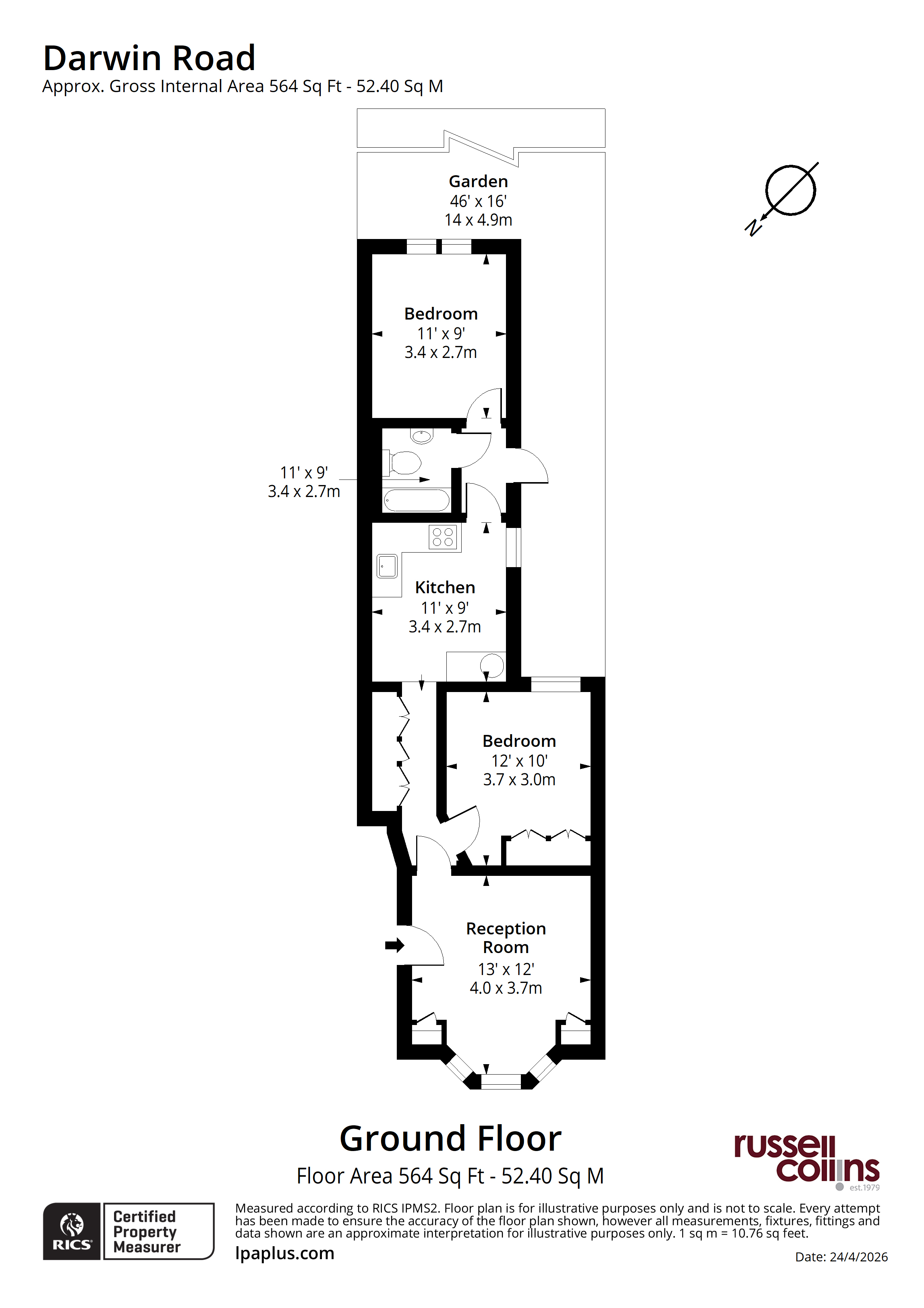 This ground floor flat occupies the entire ground floor of a handsome brick fronted property on Darwin Road and offers two double bedrooms and a private south facing garden. The kitchen is well proportioned, includes a boiler installed in April 2026, and opens directly onto the garden, with enough space for a home office (subject to consents). Both bedrooms are comfortable doubles, and the bathroom is modern in style.