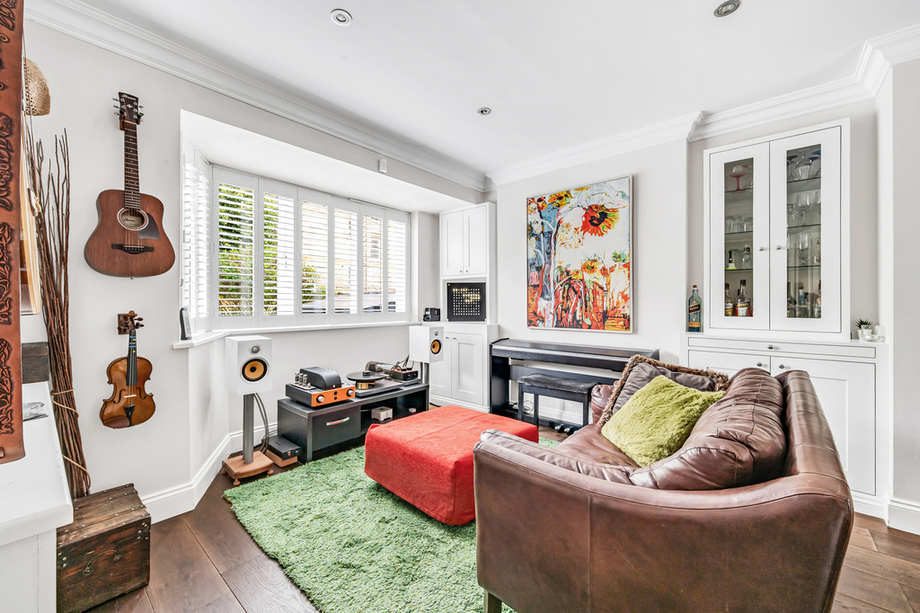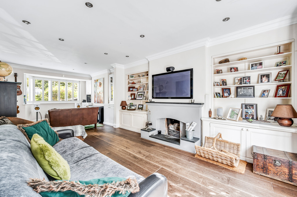 RECEPTION ROOM Double-glazing to front with plantation style shutters, radiators with covers, built-in storage/shelving, coved ceiling, oak flooring, open fireplace, double-glazed side windows & French doors to garden.