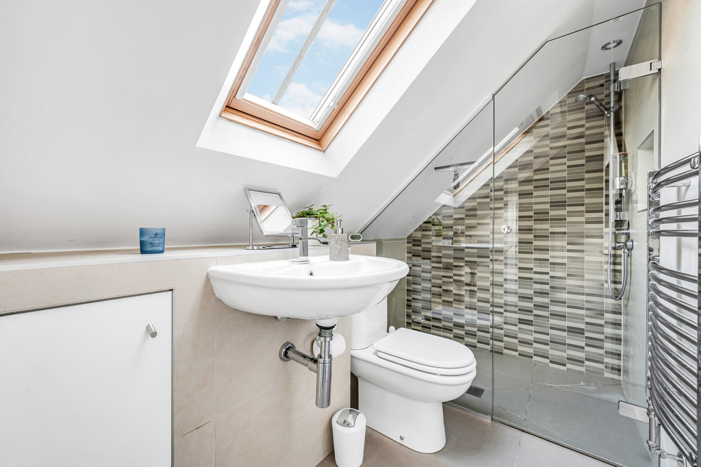 ENSUITE Tiled shower with glass screen, WC, wash hand basin, chrome heated towel rail, double glazing, tiled floor, recessed storage.