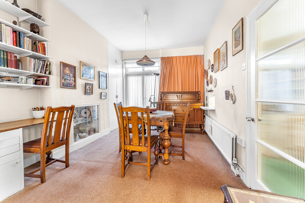 THROUGH LOUNGE Original panelled ceiling, radiators, double-glazed front bay, double-glazed French doors to garden.