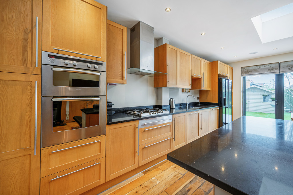 A four-bedroom semi-detached home arranged over three floors and features a thoughtful layout for modern family living. The ground floor includes a bright front reception with a feature fireplace, a guest WC, and an open-plan kitchen/dining area with doors leading to a large garden with patio and lawn.
