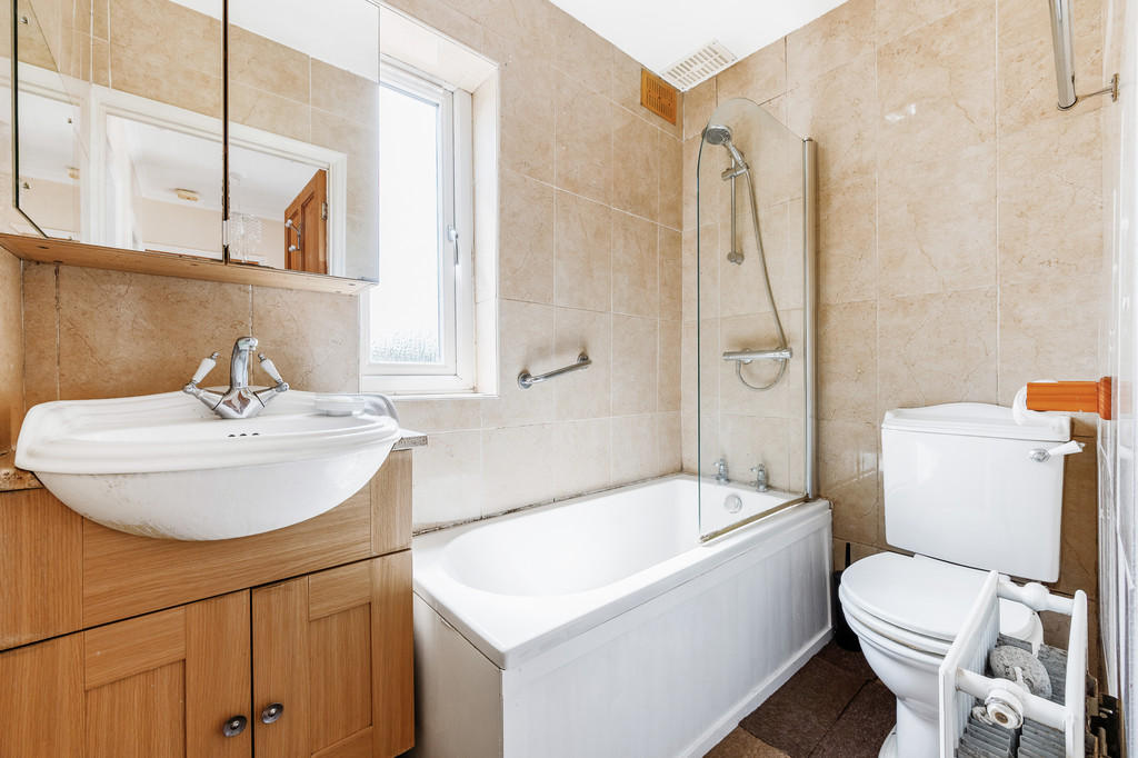BATHROOM/WC Bath with shower over (needs renewing), WC, wash hand basin with storage below, tiled walls, double-glazing, radiator.