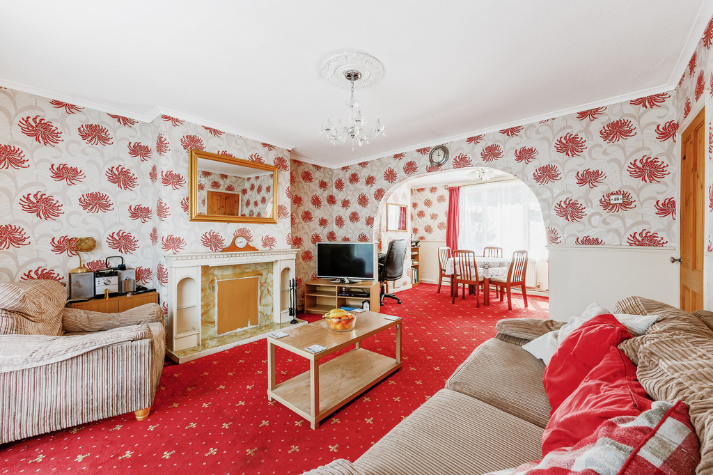THROUGH LOUNGE Ceiling rose, radiator, double-glazing, double-glazed patio door to garden.