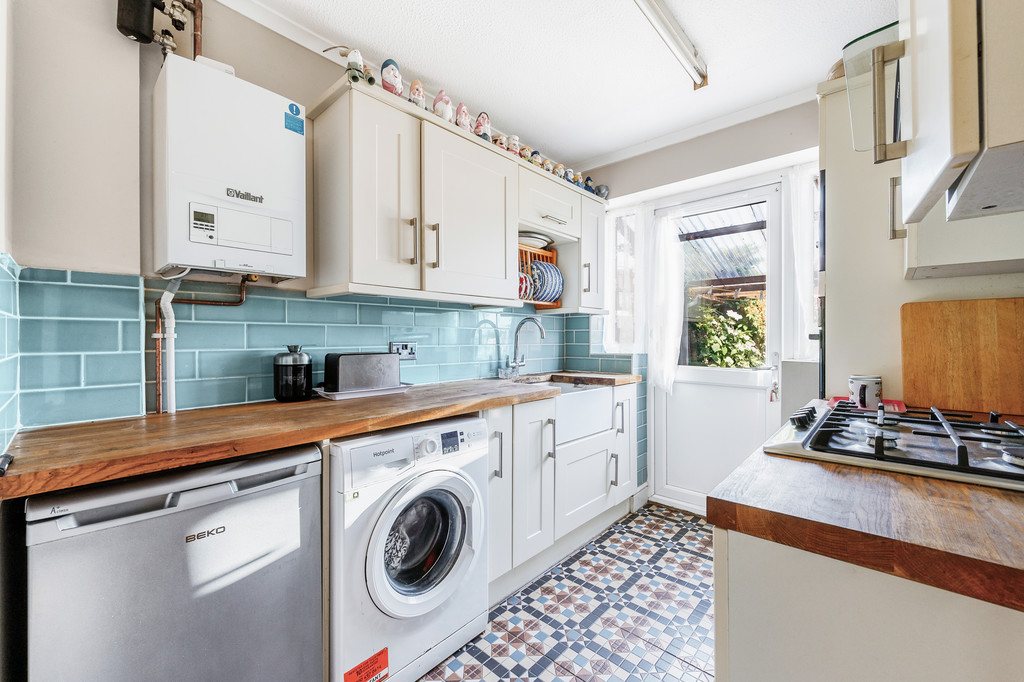 KITCHEN Wall & base units, butler sink with mixer tap, plumbing for washing machine, Bosch gas hob, electric oven, built-in microwave, tiled floor, central heating boiler, double-glazed window overlooking garden.